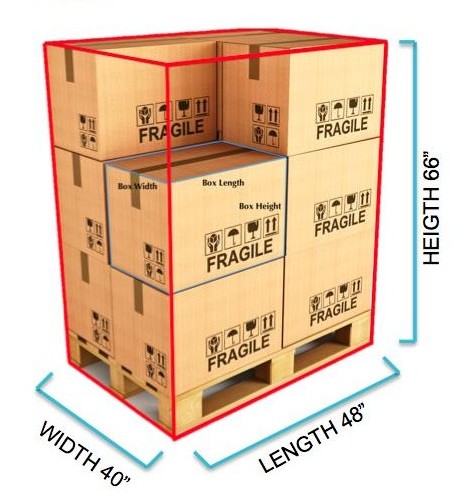 Example: Packages placed on a pallet, width 40″ in, length 48″ in, height 77″ in, actual weight 500 Kg.